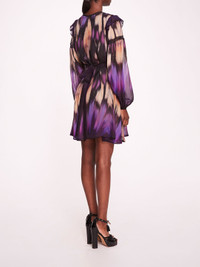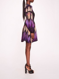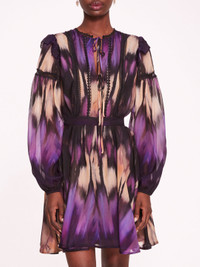 The Abstract Viscose Mini Dress is a chic and playful ensemble, featuring an a-line silhouette and a flattering v-neck design in abstract printed silk viscose. Its billowy sleeves and waist tie add a touch of femininity and versatility to the look, while delicate lace trims offer a hint of elegance. Details Pictured in purple multi 72% viscose, 28% silk Dry clean only Style ID: R75DS3726