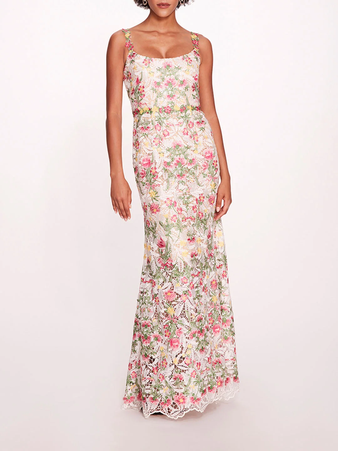The Alexis Gown is a sleeveless fit-to-flare multi color guipure gown on solid ground.