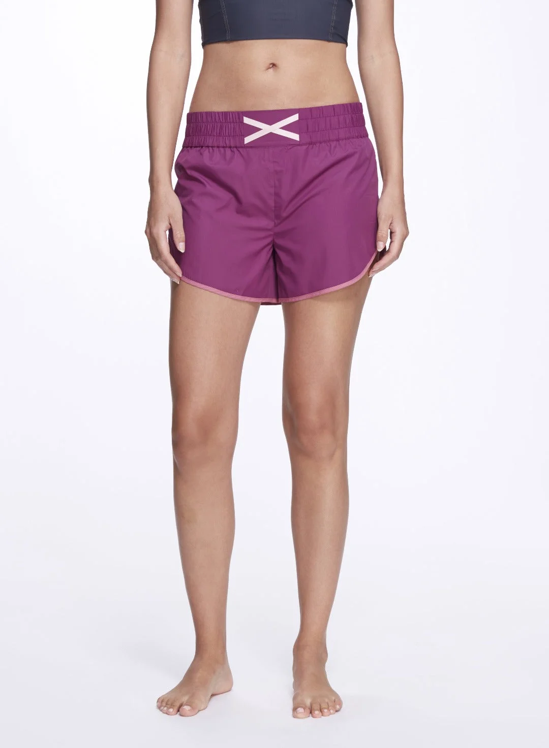 The Althea Short features a short length, a cinched waist, and a super lightweight raspberry performance outer fabric. The contrasting x detail, trim binding, half bow embroidery on the sides and the soft interior lining make for a super chic and comfortable gym short!