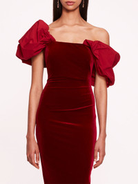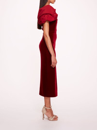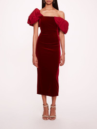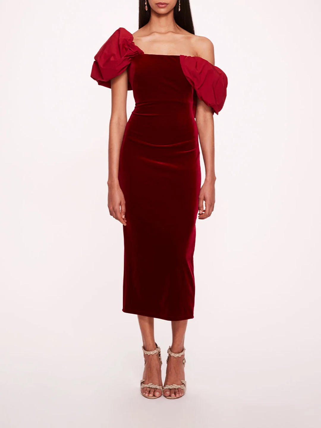 The Asymmetrical Velvet Midi Dress features a fitted cocktail silhouette that effortlessly blends luxury and allure. The statement-making asymmetrical taffeta puff sleeves add a dramatic flair, elevating the dress to a sophisticated yet edgy evening piece.