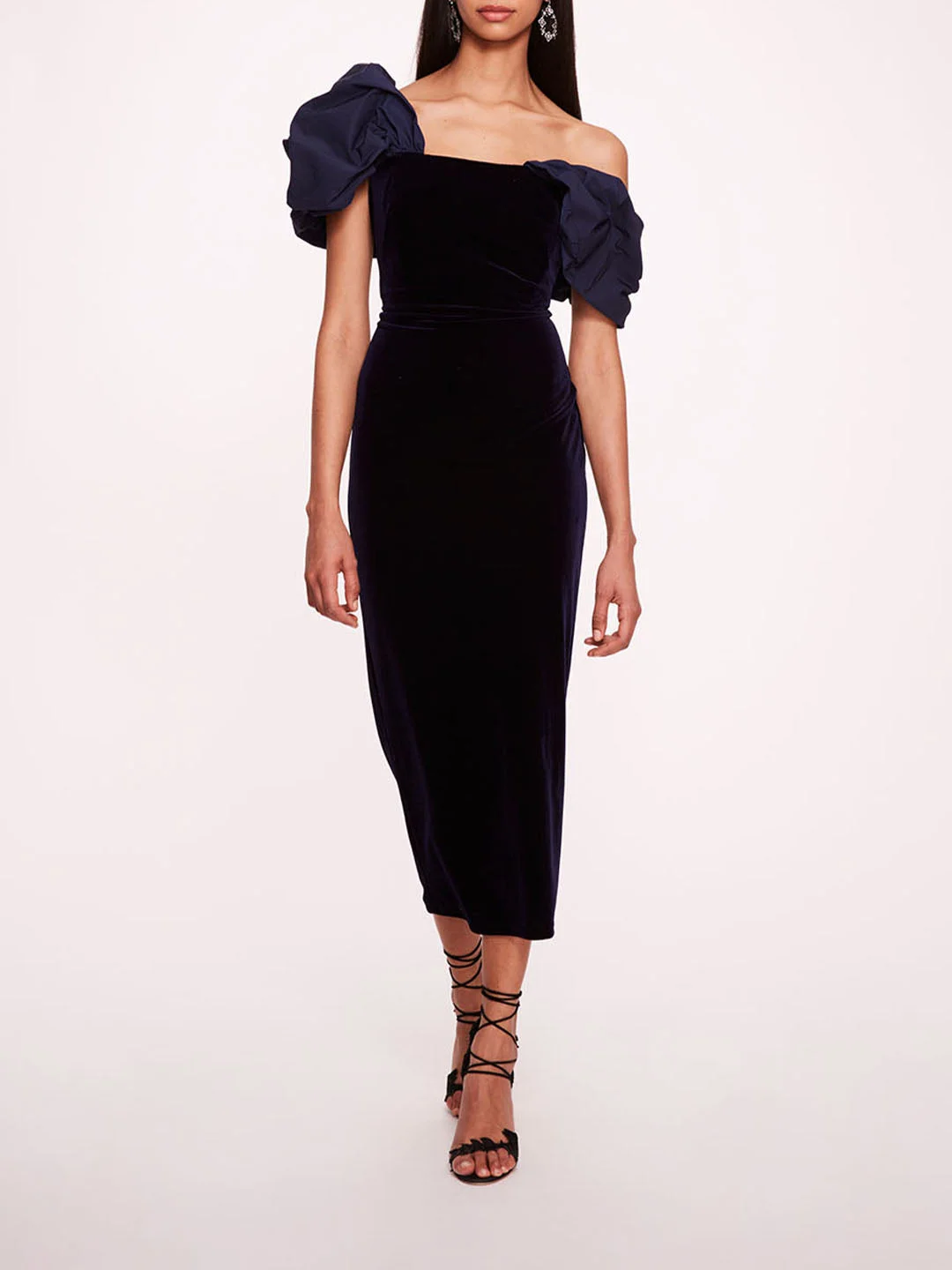 The Asymmetrical Velvet Midi Dress features a fitted cocktail silhouette that effortlessly blends luxury and allure. The statement-making asymmetrical taffeta puff sleeves add a dramatic flair, elevating the dress to a sophisticated yet edgy evening piece. This item will ship in 7–10 business days. Details Pictured in midnight 92% polyester, 8% spandex Dry clean only Style ID: N78M3820