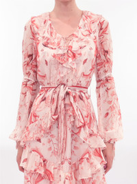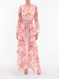 This silk chiffon maxi dress features a flattering V-neckline accented with soft ruffle detailing and full-length sleeves that add graceful movement. A cascading ruffle skirt flows effortlessly from the waist, cinched with a self-tie belt for subtle definition. Light and romantic, this design offers an elevated approach to modern femininity.