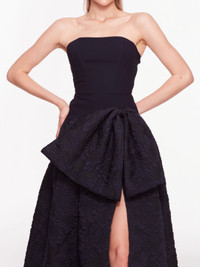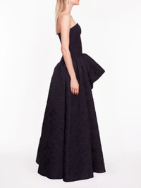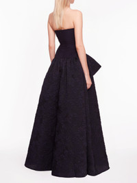 The Calathea Gown is a strapless gown designed with calathea cloque detailed on 4-way stretch crepe. The ballgown features a high slit and dramatic bow. This item will ship in 7–10 business days Details Pictured in navy 100% polyester Dry clean only Style ID: N72G3666