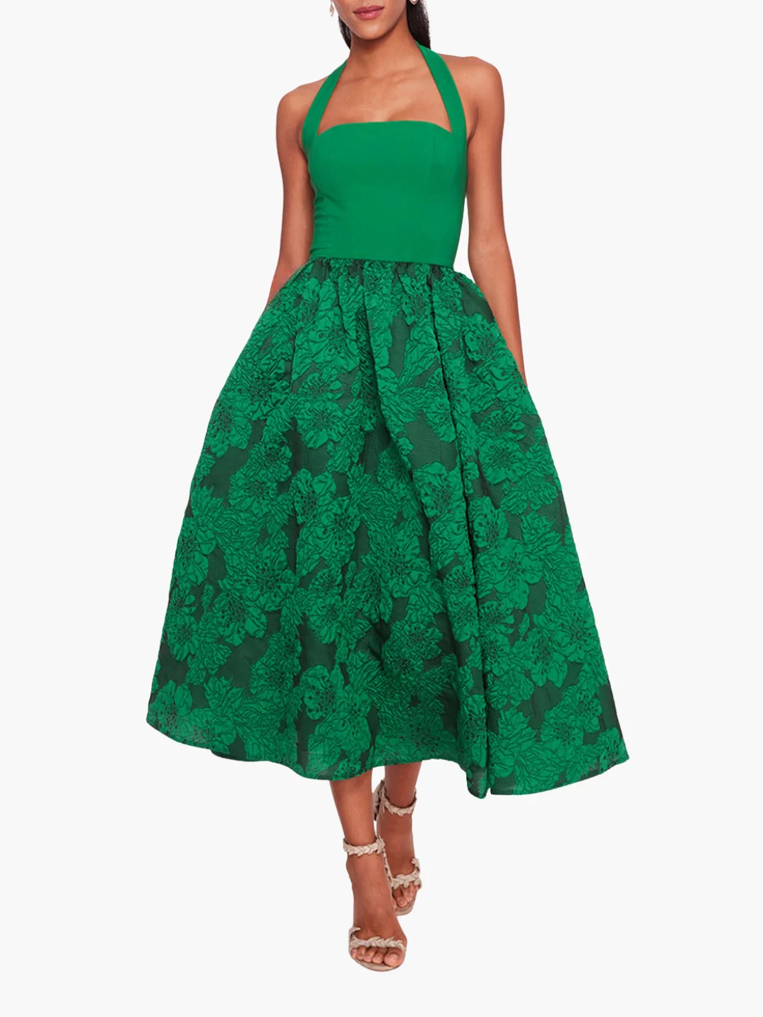 The Calathea Halter Dress is a halter midi dress designed with a stretch crepe bodice and a full skirt in lightweight cloque. This item is Final Sale & will ship in 7–10 business days Sizing and Fit • Silhouettes are designed to fit true to size, following a classic American fit. • Clients familiar with European sizing may wish to consider sizing down for a closer fit. • Many styles are crafted from exquisite woven fabrics, often adorned with delicate embellishments, and are intended to maintain their structure without stretch unless otherwise specified. • For bespoke sizing guidance or personalized assistance, our concierge team is delighted to help at concierge@marchesafashion.com.
