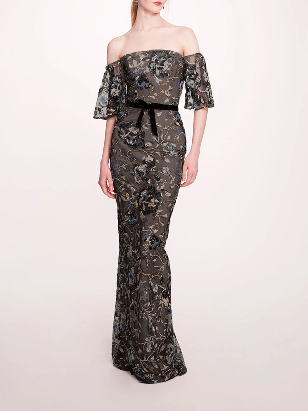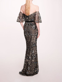 Embrace effortless elegance with the Climbing Vines Gown, featuring an off-the-shoulder silhouette and intricate sequin floral embroidery on airy tulle. This enchanting column dress flows gracefully, highlighting your figure while adding a touch of whimsy and sparkle. Details Pictured in black blue 100% polyester Dry clean only Style ID: N76G3808