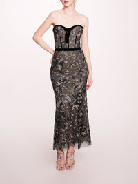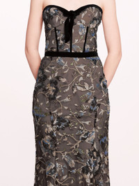 Make a stunning impression with the Climbing Vines Midi Dress, featuring a strapless design adorned with exquisite sequin floral embroidery on delicate tulle. The corset-style velvet detailing on the bodice accentuates your figure, offering a perfect blend of sophistication and allure. Details Pictured in black blue 100% polyester Dry clean only Style ID: N76M3809