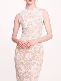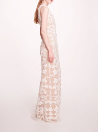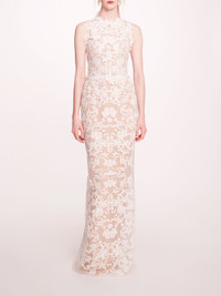 Exude timeless elegance in the Corded Column Gown, crafted from exquisite corded lace and adorned with delicate floral appliques. This sleeveless silhouette gracefully hugs your figure, creating a stunning profile for any formal occasion. Details Pictured in ivory 70% polyester, 30% nylon Dry clean only Style ID: N76G3797
