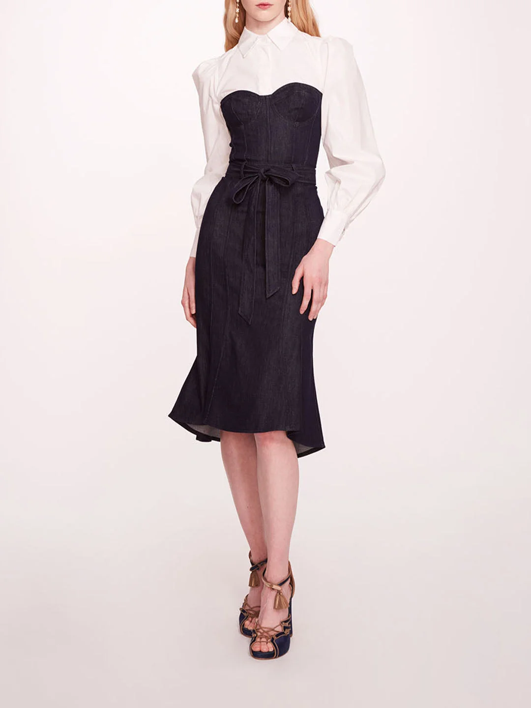 The Denim Poplin Shirt Dress features a unique intermixed design of cotton and denim. With bustier corset details and a fit-and-flare skirt, it offers a playful yet polished silhouette. The classic cotton poplin collared shirting and a sleek metal zipper at the center back complete this midi dress.