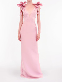 This sleeveless column gown is crafted from lustrous silk mikado and defined by a deep V-neckline that elongates the silhouette. Hand-draped floral detailing at the shoulder adds a sculptural, couture-inspired accent. Sleek and sophisticated, this gown balances clean lines with romantic artistry.