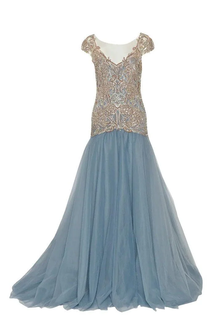 DETAILS AND INSIGHT Drop Waist Embroidered Ball Gown From Marchesa Intricately Embellished Bodice With Glass Beading, V-Neckline, Cap Sleeves, And Back Zip Closure Fitted Silhouette Through Drop Waist With Full Tulle Skirt And Train Detail 100% Polyester With 100% Nylong And 92% Silk, 8% Spandex Lining, Dry Clean Made In USA With American Sizing Available In Slate Blue Style M07800