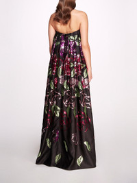 The Duchess Degrade Gown black multi is reimagined sophistication. Constructed from bold floral degrade fabric, the strapless column gown features a semi sweetheart neckline and billowing cape.
