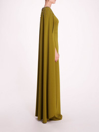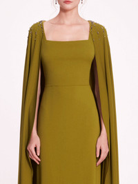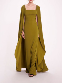 Make a statement in the Embellished Cape Gown. Featuring a chic square neckline and a dramatic cape adorned with exquisite embellishments, this gown exudes elegance for any formal event or gala. Details Pictured in olive 97% polyester, 3% spandex Dry clean only Style ID: N75K3768