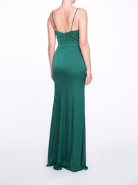 The Emilia gown is revealing, yet classic. The stretch satin charmeuse dress features a plunging neckline joined by a swatch of matching soft jade tulle. The fit-to-flare silhouette and single mid thigh leg slit add to expression of sensuality. Details Pictured in jade 97% polyester, 3% spandex Dry clean only Style ID: BM2974