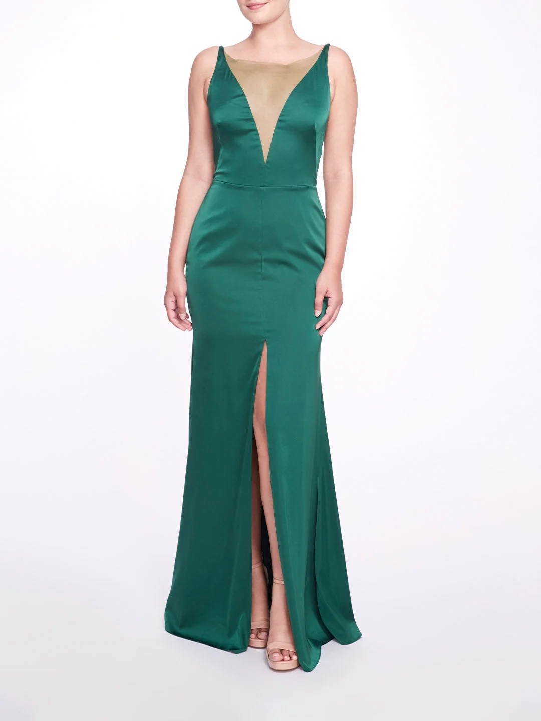 The Emilia gown is revealing, yet classic. The stretch satin charmeuse dress features a plunging neckline joined by a swatch of matching soft jade tulle. The fit-to-flare silhouette and single mid thigh leg slit add to expression of sensuality.