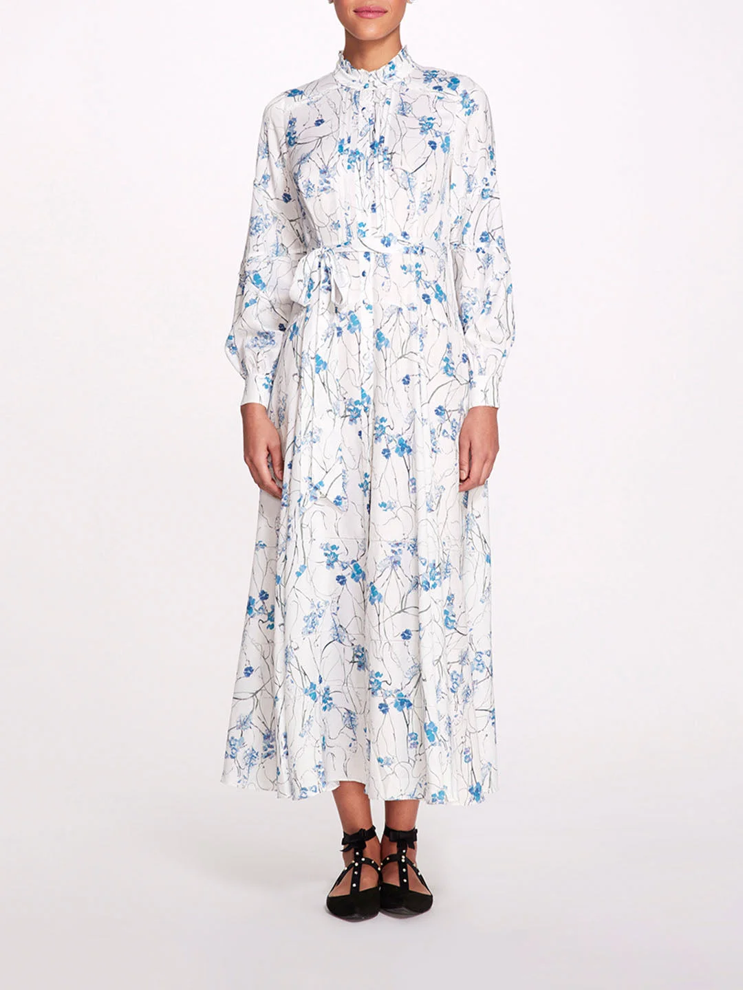 The Fiorella shirtdress is constructed with floral printed sateen and features a full skirt and cuffed long sleeve. The dress is complete with embroidered scalloped edging along the mandarin collar.