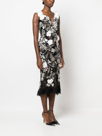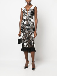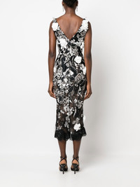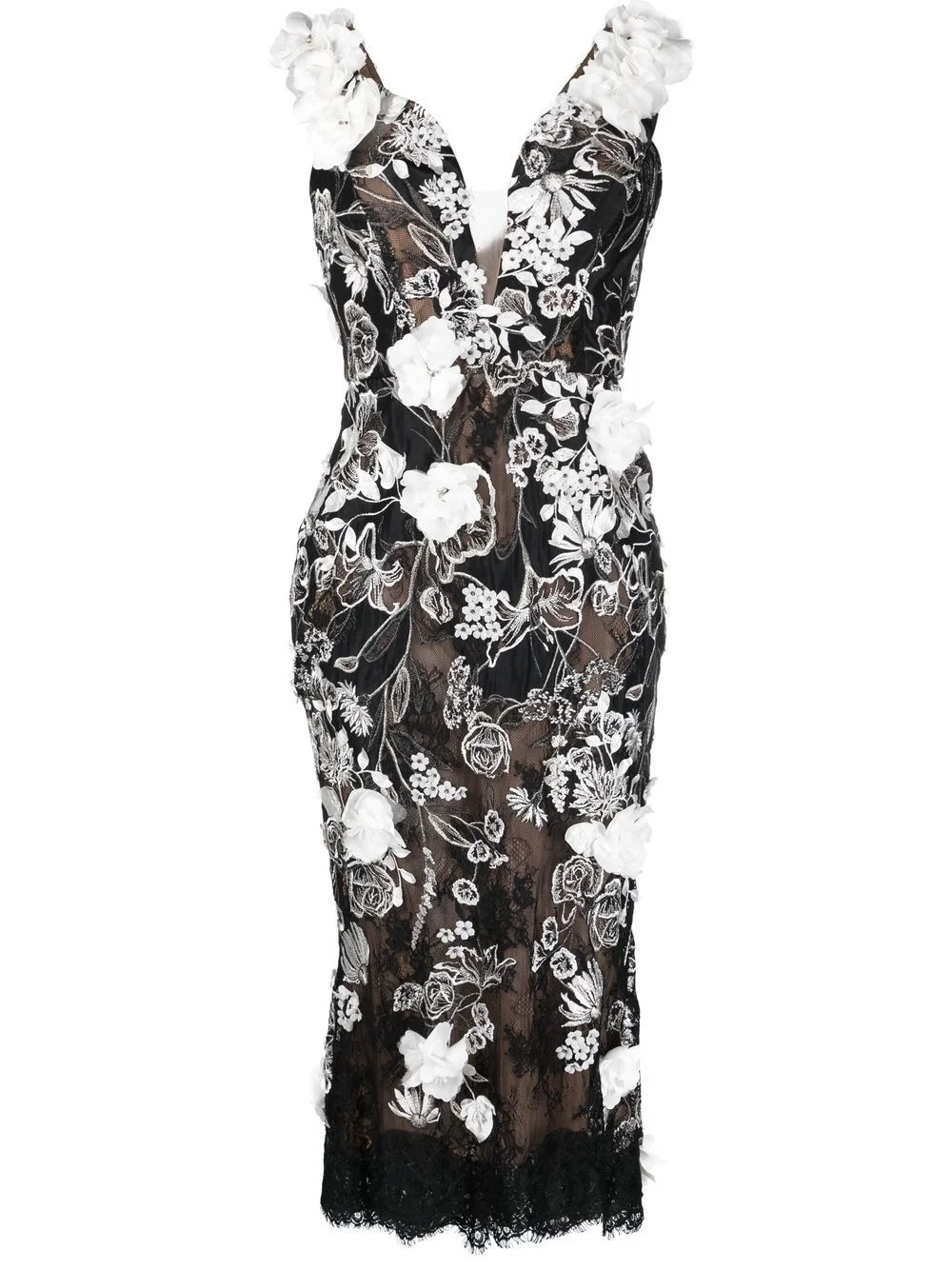 floral-applique midi dress black/white silk blend floral embroidery floral applique ruffled detailing plunging V-neck V-back rear tie fastening sleeveless straight hem mid-length Made in United States Composition Outer: Polyester 77%, Nylon 23% Lining: Silk 92%, Elastane 8% SIZE & FIT Model measurements Height 5 ft 10 in(1.78 m) Bust/Chest 31.49 in(80 cm) Hips 37 in(94 cm) Waist 23.62 in(60 cm) FittingInformation This piece fits true to size. We recommend you get your regular size Designed for a close fit at the bust, waist and hips Made with a mid-weight fabric Washing instructions Dry Clean Only