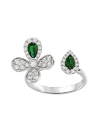 The Floral White Gold Ring features an 18 karat white gold band set with diamonds. The open ring is enriched with a diamond four-leaf clover and teardrop-shaped natural emerald with pave diamonds. Details Pictured in white gold 18KT 0.51 cts VS2/SI1 Style: MVR90004UD