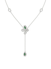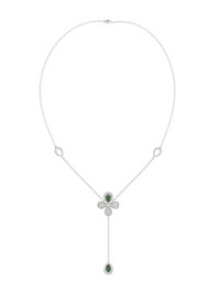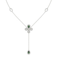 The Floral White Gold Y Necklace is an 18 karat white gold delicate chain with a diamond and natural emerald four-leaf clover at its center. A delicate teardrop-shaped diamond pave emerald holds onto the clover by a white gold chain. Details Pictured in white gold 18KT 1.01 cts VS2/SI1 Style: MVN90004UD