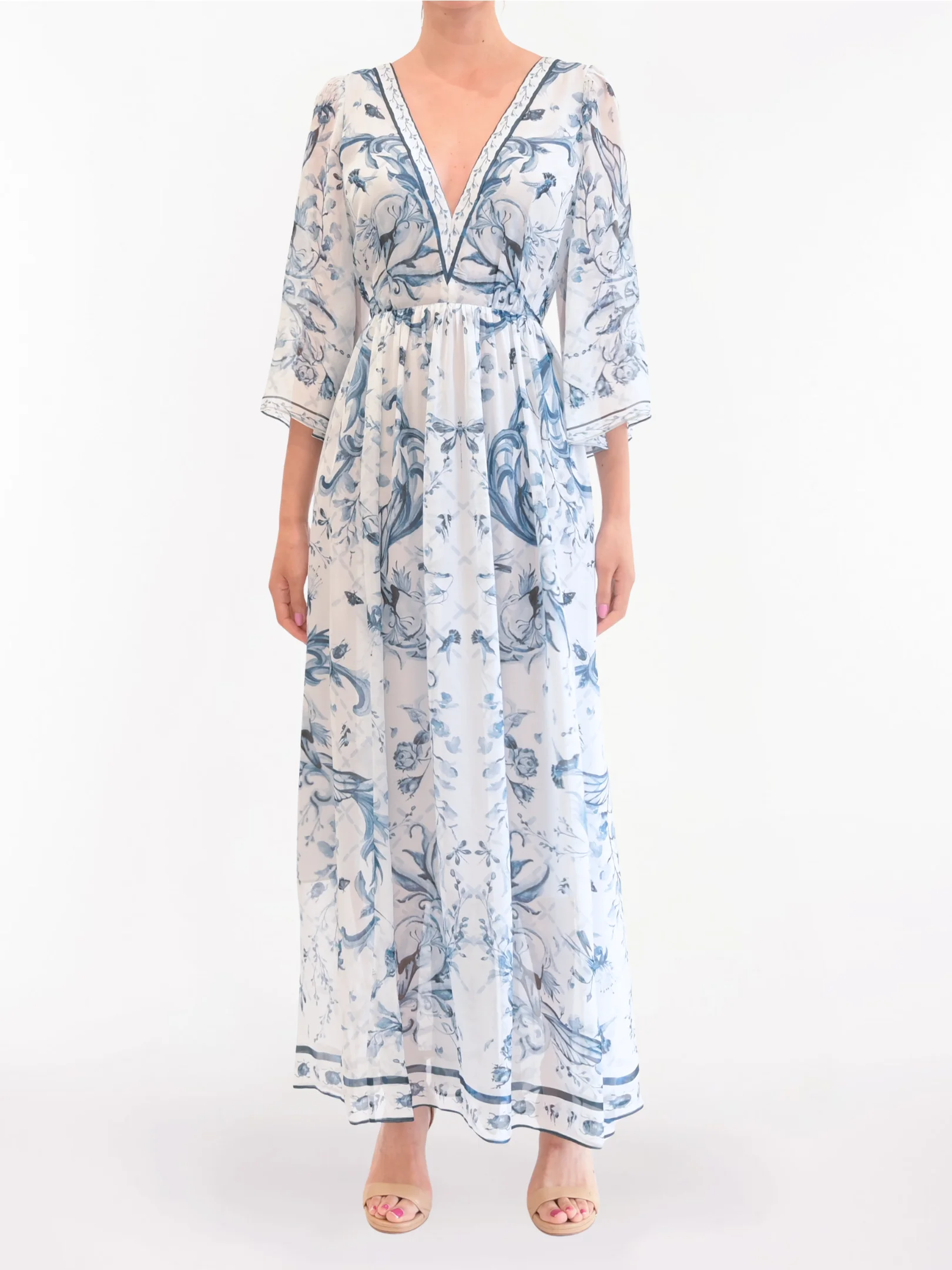 This silk chiffon maxi dress features a flattering V-neckline and fluid kimono-style sleeves that create an easy, draped silhouette. Designed with a loose fit and softly gathered waist, the look offers graceful movement and understated elegance. Lightweight and romantic, this style is perfect for elevated day-to-evening wear.