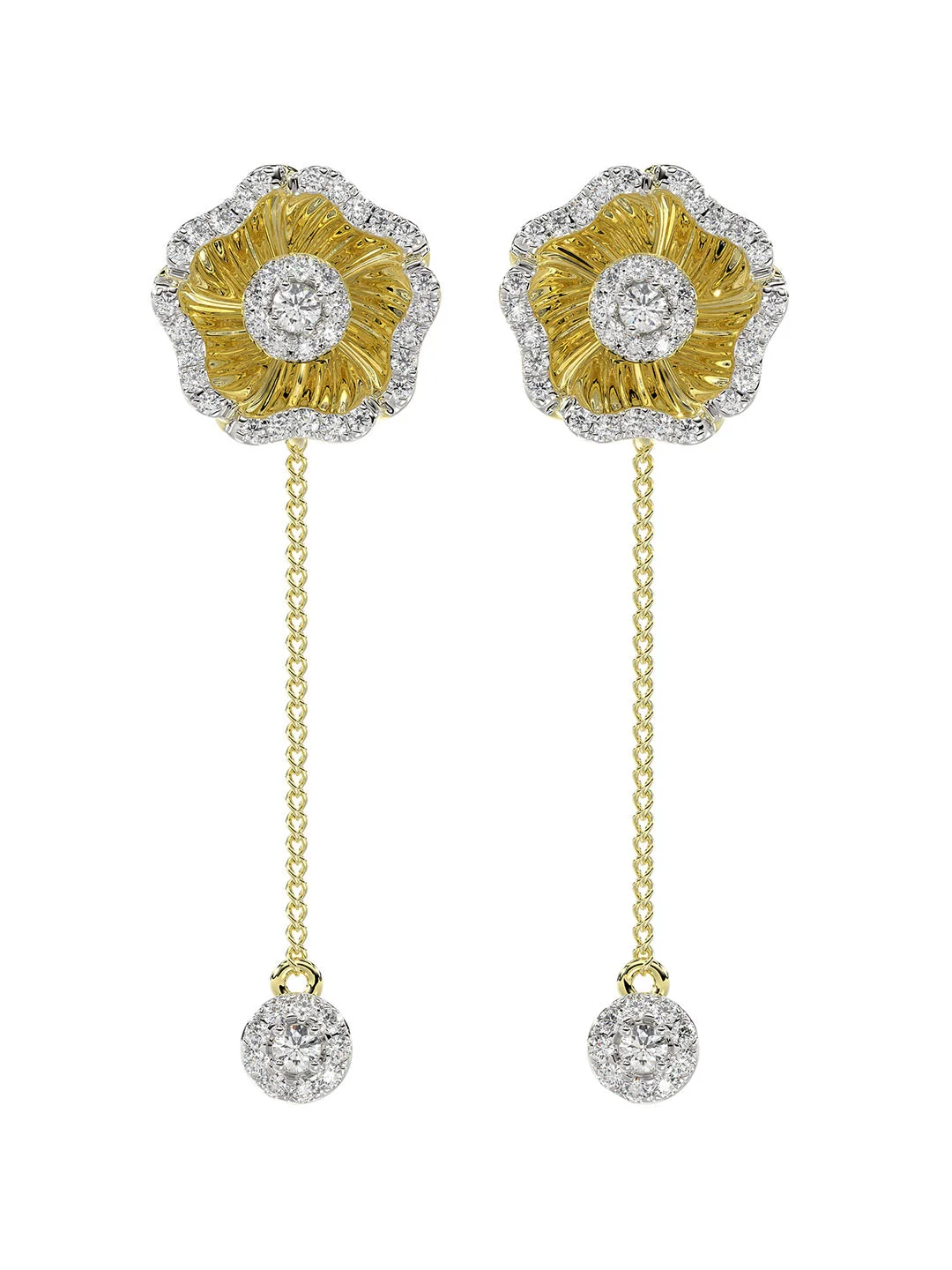 The Halo Flower Rose Gold Drop Earrings feature rose gold and natural diamond camellia-inspired flowers, complete with single natural diamonds hanging from a rose gold chain. Details Pictured in rose gold 18KT 0.51 cts VS2/SI1 Style: MVE90012