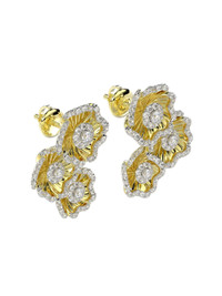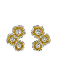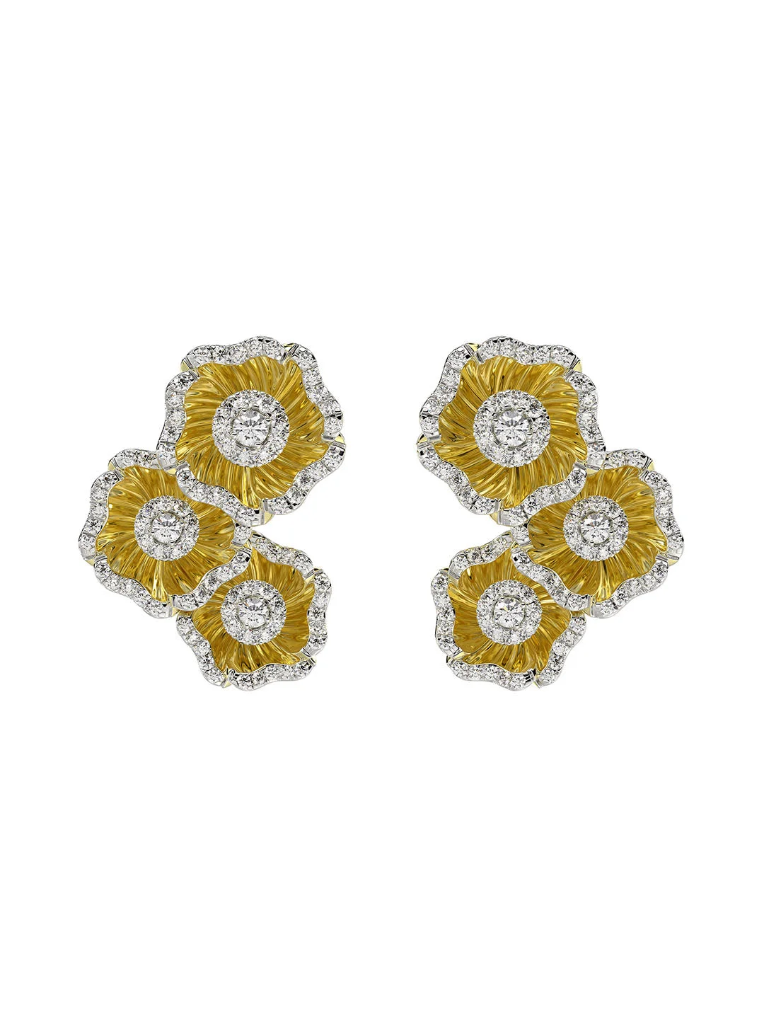The Halo Flower Yellow Gold Earrings feature a trio of yellow gold and natural diamond camellia-inspired flowers, complete with a natural diamond at the center of each flower. Details Pictured in yellow gold 18KT 1.02 cts VS2/SI1 Style: MVE90031