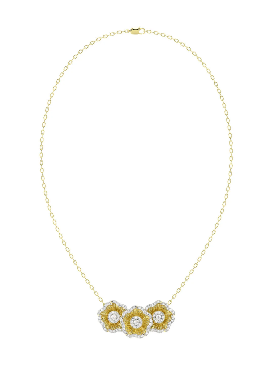 The Halo Flower Yellow Pendant Necklace is an 18 karat yellow gold delicate chain with a pendant composed of three yellow gold and natural diamond camellia-inspired flowers at its center. Details Pictured in yellow gold 18KT 0.51 cts VS2/SI1 Style: MVN90019