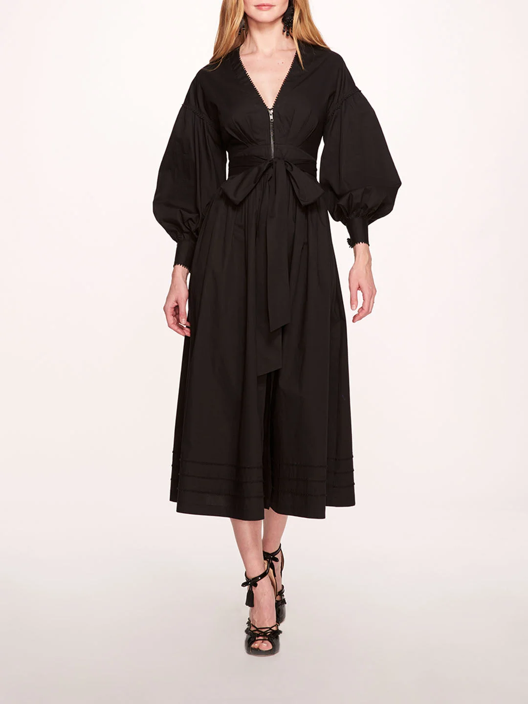 The Poplin Midi V-Neck Dress combines effortless style and comfort with its cotton poplin fabric and a-line skirt. Featuring billowy cuffed sleeves, playful bobble trim details, and a front metal zipper, this dress is perfect for any occasion. Complete your look with the separate belt for a cinched waist or wear it loose for a more relaxed silhouette.