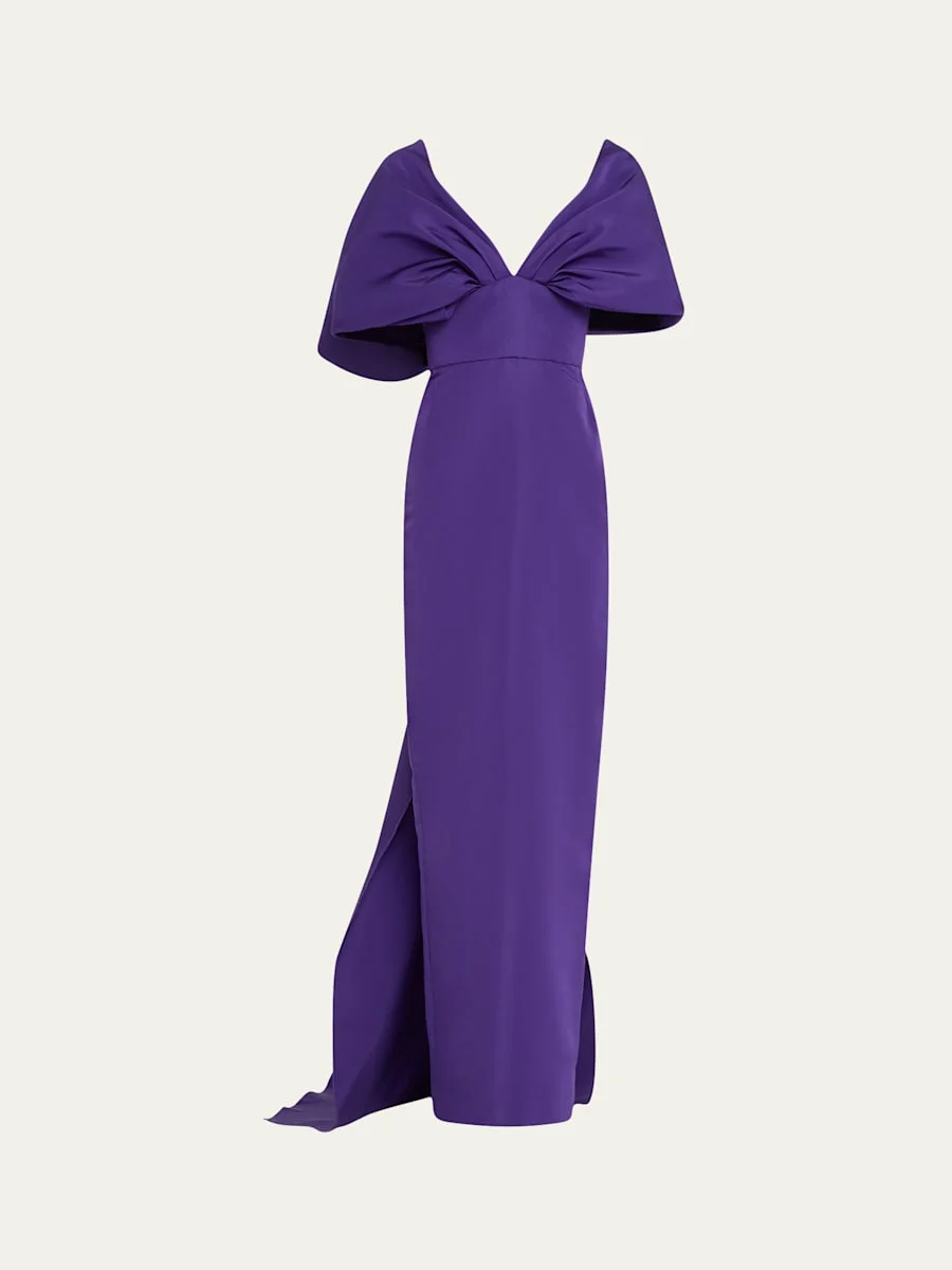 Marchesa draped sleeve gown crafted from silk faille fabric V neckline Short kimono sleeves Column silhouette Falls below the ankles Back train Back zip Silk Lining: Silk Dry clean Made in USA from imported materials Online Inquiries: BGS21_B9PV3| Store Inquiries: #4938952