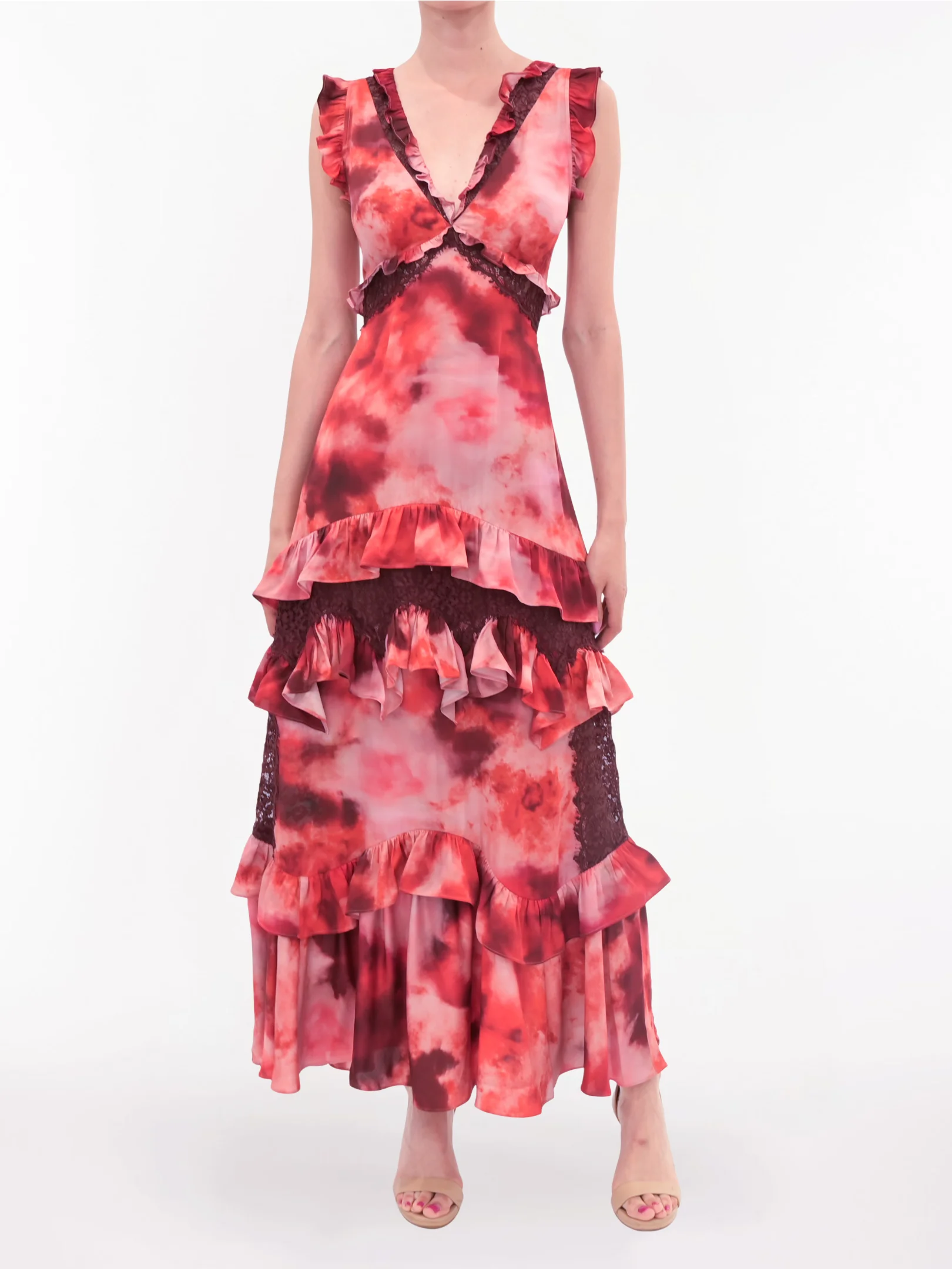 This V-neck maxi dress features delicate cap sleeves finished with soft ruffle detailing. Designed in an A-line silhouette, the skirt flows with cascading ruffles accented by subtle lace details for added texture and romance. Light and feminine, this style offers effortless elegance for day-to-evening wear.