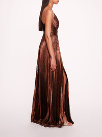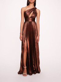 The Metallic Lame Pleated Gown features a striking one-shoulder design with sharp knife pleats that create a dramatic, sculptural effect. A keyhole bodice detail and front slit add an alluring touch. This item will ship in 7–10 business days. Details Pictured in bronze 100% polyester Dry clean only Style ID: N78G3782