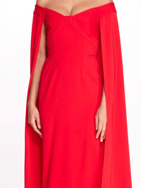 The embodiment of chic, the off shoulder caped column gown features a draped bodice and cape effect sleeves to create an elegant silhouette. Lovely in solid cadi crepe, it's the quintessential addition to any charming wardrobe. Details Pictured in true red 95% polyester, 5% spandex Dry clean only Style ID: N66G3423
