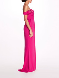 The charm of glamour, this solid crepe off-shoulder column gown is composed of a draped bodice, draped skirt with a slit, and molded 3D satin flower appliqués on draped shoulders. Details Pictured in orchid 95% polyester, 5% spandex Dry clean only Style ID: N66G3424