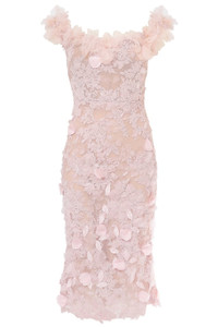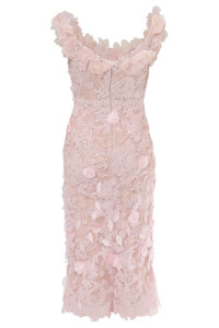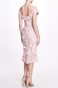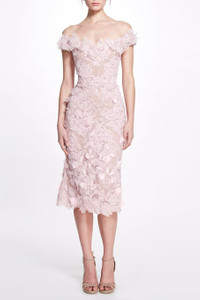DETAILS AND INSIGHT Marchesa off shoulder midi dress in blush. 100% Polyester Dry Clean Made in the United States Style M37905