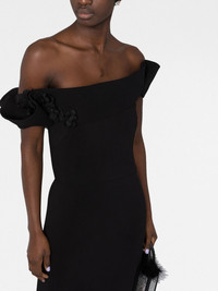 off-shoulder midi dress Marchesa illustrates its signature romantic aesthetic with this midi dress. The one-shoulder construction is elevated with floral appliques for a whimsical finish. Made in United States Composition Lining: Polyester 100% Outer: Polyester 96%, Spandex/Elastane 4% SIZE & FIT Model measurements Height 5 ft 10 in(1.77 m) Bust/Chest 32.28 in(82 cm) Hips 35.03 in(89 cm) Waist 25.19 in(64 cm) FittingInformation This piece fits true to size. We recommend you get your regular size Designed for a close fit at the bust, waist and hips Made with a mid-weight fabric Washing instructions Dry Clean Only