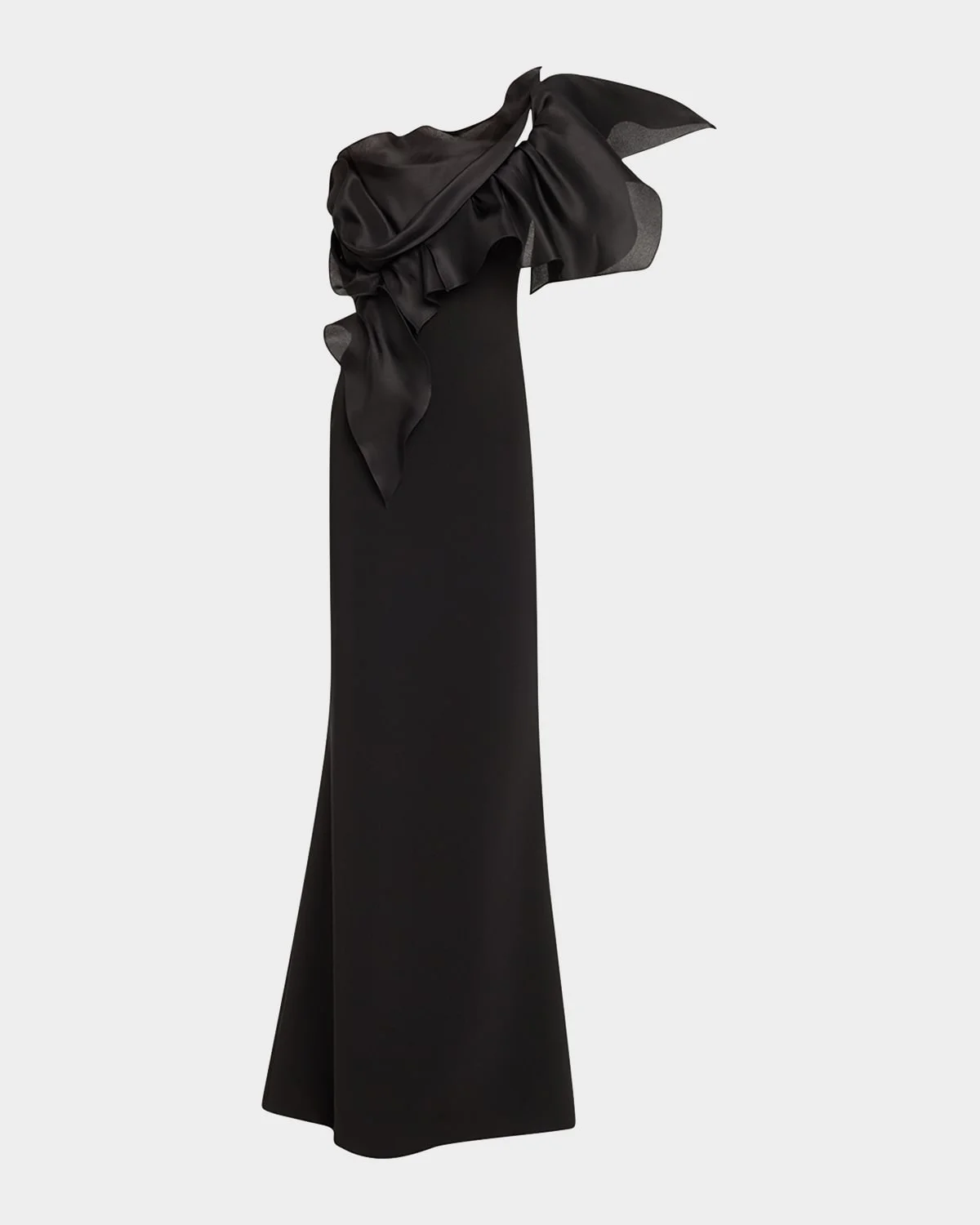 - Marchesa stretch crepe gown featuring an abstract draped ruffle neckline and a sheer corsetry constructed back panel - One-shoulder neckline - Short sleeve - Fit-and-flare silhouette - Floor length - Invisible back zip - Viscose/elastane - Lining: Silk/elastane - Dry clean - Made in USA from imported materials
