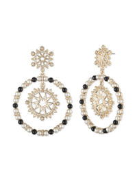 The Black Orbital Pearl Earring is a drop earring featuring alternating black and white faux pearls framing a geometric charm at the center. The statement earrings are gold plated with a gold tone and gold hardware. Details Pictured in black One size Style ID: 16G00217