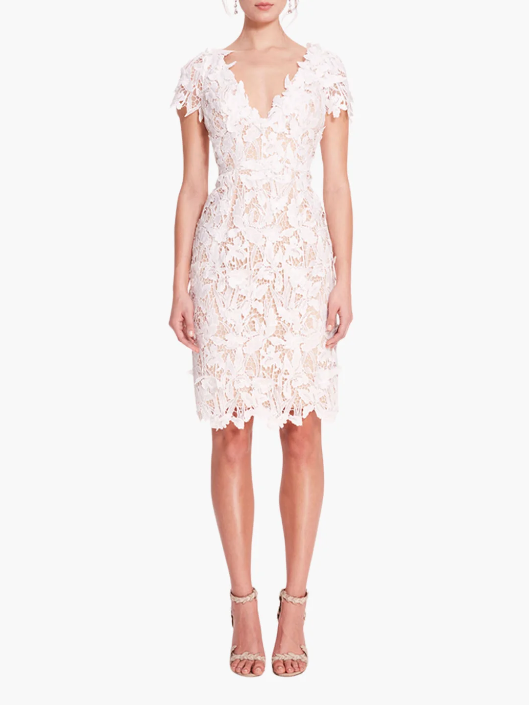 Embrace elegance with the Organic Lace Mini Dress. Featuring a flattering v-neckline and delicate short sleeves, this guipure lace creation is adorned with 3-D appliques. This item is Final Sale & will ship in 7–10 business days Sizing and Fit • Silhouettes are designed to fit true to size, following a classic American fit. • Clients familiar with European sizing may wish to consider sizing down for a closer fit. • Many styles are crafted from exquisite woven fabrics, often adorned with delicate embellishments, and are intended to maintain their structure without stretch unless otherwise specified. • For bespoke sizing guidance or personalized assistance, our concierge team is delighted to help at concierge@marchesafashion.com.