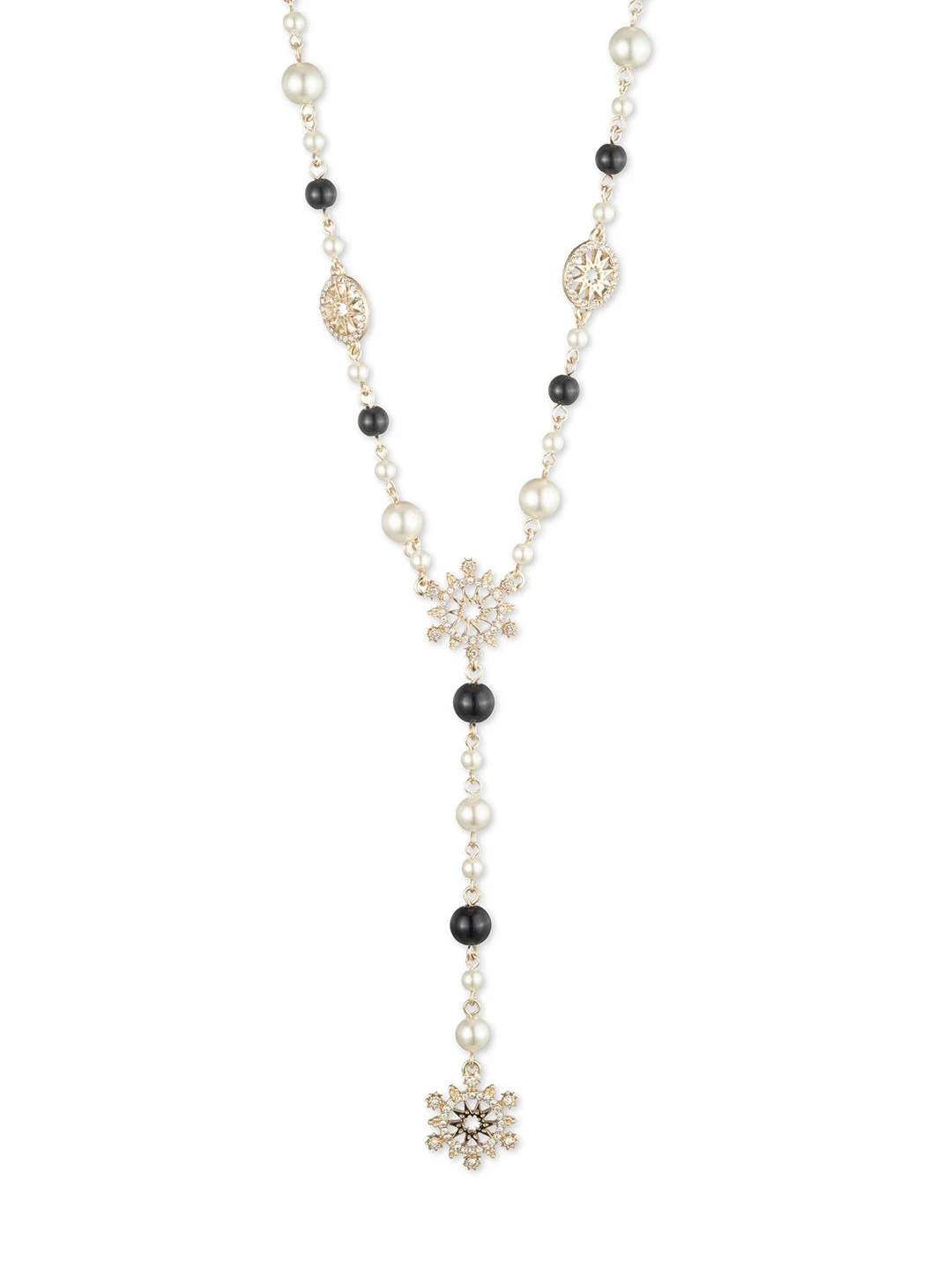The Pearl Y Necklace features a pattern of petite gold links and faux black and white pearls, complete with geometric floral charms. The statement gold necklace is featured in a gold tone with gold hardware and measures 16 inches in length. Details Pictured in black 16 in Style ID: 16N00091