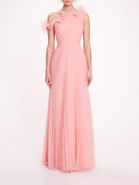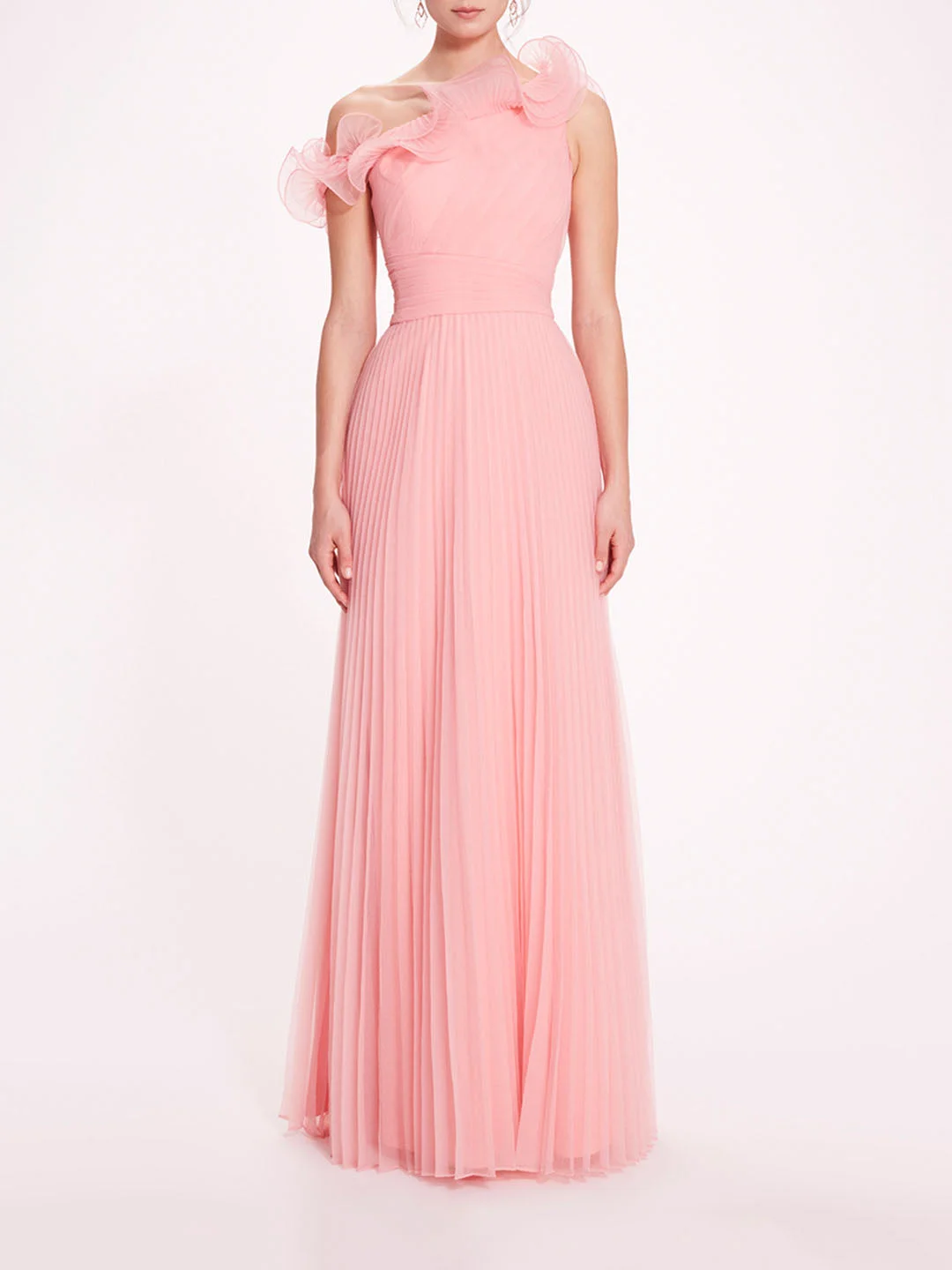 Exude ethereal beauty in the Pebble Organza Gown. Crafted from pebble organza, this a-line gown creates a timeless silhouette with its off-the-shoulder neckline and sun-ray pleated skirt.