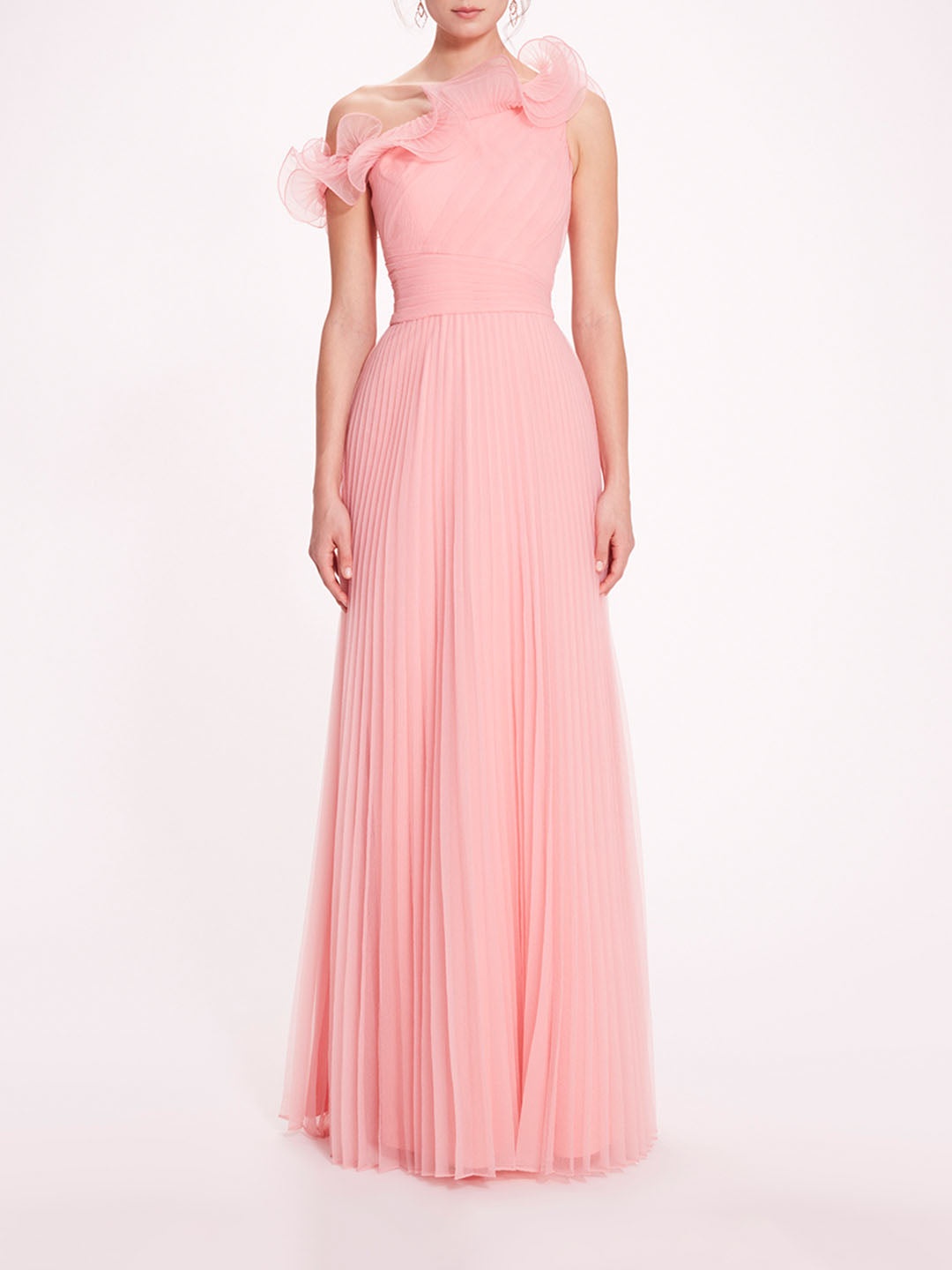 Exude ethereal beauty in the Pebble Organza Gown. Crafted from pebble organza, this a-line gown creates a timeless silhouette with its off-the-shoulder neckline and sun-ray pleated skirt. Details Pictured in blush 100% polyester Dry clean only Style ID: N75G3749