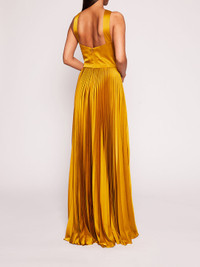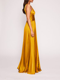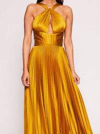 The Pleated Foil Gown is crafted with metallic georgette fabric and features a halter neckline and pleated sunburst skirt. The a-line gown is complete with a pleated criss-cross band around the waist and center front keyhole. Details Pictured in gold 96% polyester, 4% spandex Dry clean only Style ID: N69G3529