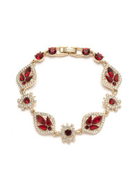 The Poised Gold Bracelet alternates between varying red geometrical stones outlined in crystals, strung together by gold hardware. The dainty bracelet is gold plated with a gold tone and measures 7.25 inches in length. Details Pictured in gold 7.25 in Style ID: 16B00072