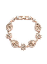 The Poised Rose Bracelet alternates between varying rose geometrical stones outlined in crystals, strung together by gold hardware. The dainty bracelet is gold plated with a rose gold tone and measures 7.25 inches in length. Details Pictured in rose gold 7.25 in Style ID: 16B00073