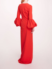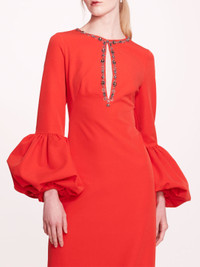 Make a grand entrance in the Puffed Sleeve Column Gown, featuring long sleeves crafted from luxurious crepe and adorned with a stunning keyhole detail. The beaded jewel embellishments add a touch of sparkle, while the puffed sleeves create a dramatic yet elegant silhouette. Details Pictured in scarlet 92% polyester, 8% spandex Dry clean only Style ID: N77K3803