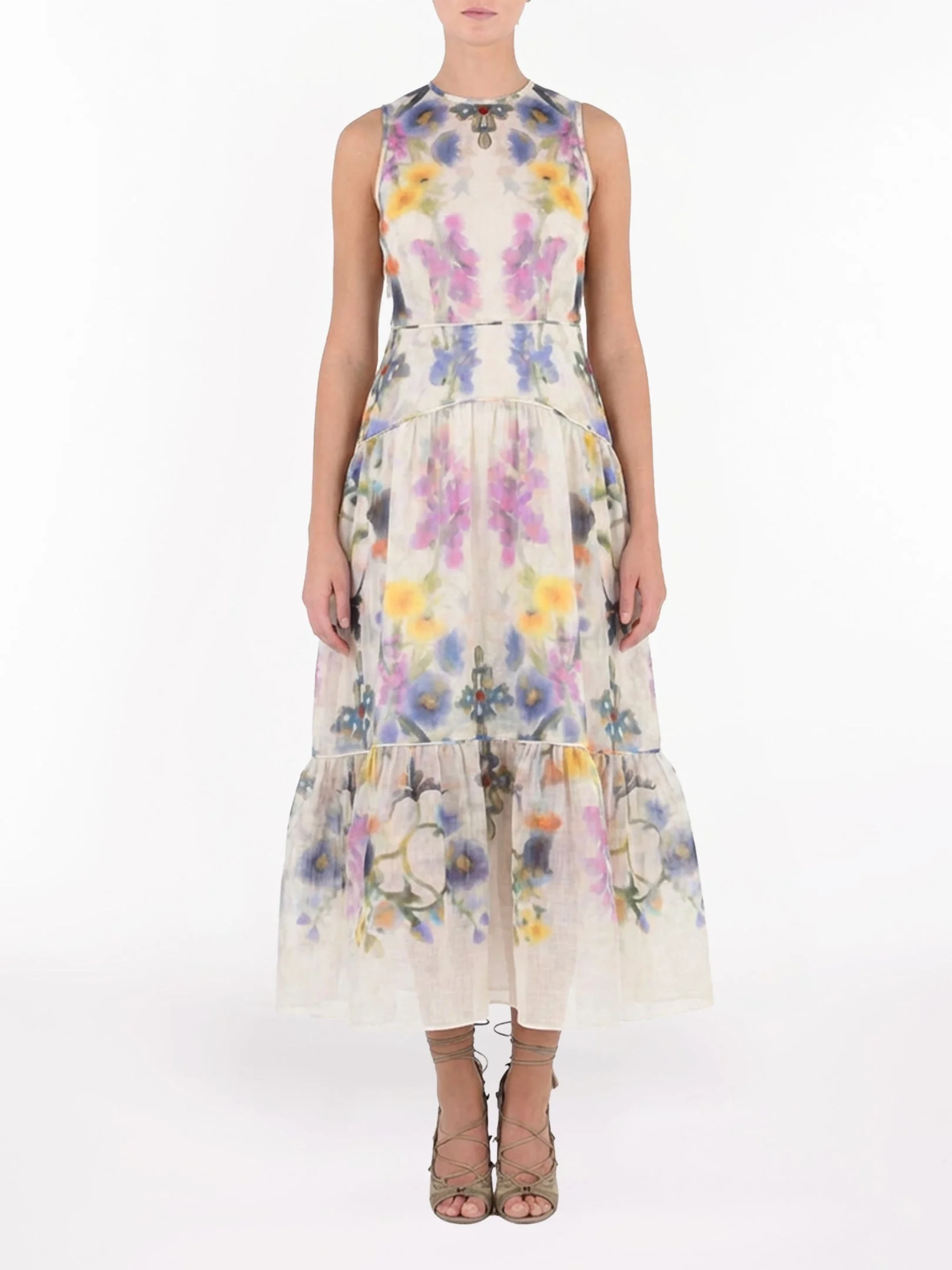 This sleeveless maxi dress is crafted from airy ramie and designed with a classic crew neckline and fluid full-length silhouette. Side lacing details softly define the waist, adding a subtle romantic finish. Effortless and refined, this style is perfect for day-to-evening wear.