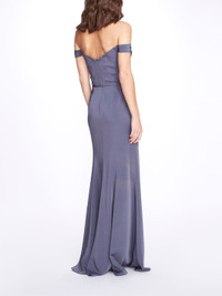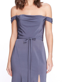 Modern romance becomes an effortless reality in the Rimini gown in steel blue. Featuring an amorous pleated bodice, a lush ribbon belt at the waist, and a soft sweetheart off the shoulder neckline.