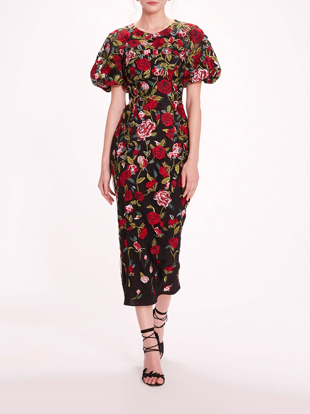 Make a statement in the Roses Tulle Midi Dress. With its bubble-sleeved and delicate embroidery on tulle, complemented by an open keyhole back detail and round neckline, this tea-length dress exudes timeless elegance, perfect for garden parties and cocktail events. This item will ship in 7–10 business days Details Pictured in black red 100% nylon Dry clean only Style ID: N75M3736