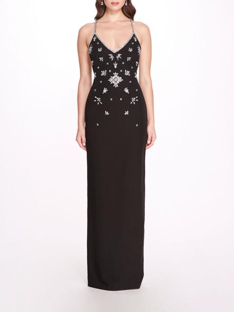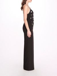 The Scattered Crystal Column Gown features a v-neckline, crystal embellished straps, and crisscross bow detail on the back. Crafted with jewel-embellished crepe, the sleeveless column dress embodies subtle glamour. Details Pictured in black 87% polyester, 13% spandex Dry clean only Style ID: N65G3420