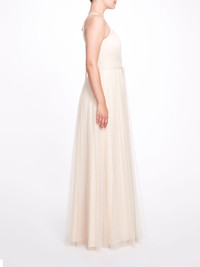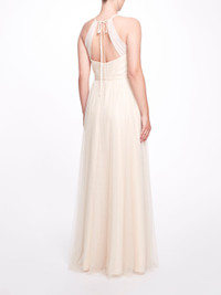 The Sicily gown in champagne is reminiscent of its namesake, a city in Italy. Featuring a halter neck, a-line silhouette, tulle panels, a sheer construction, a waist tie, a back tie fastening, and an open back, this dress is elegant and heavenly. Details Pictured in Champagne Tulle Halter Neck A-Line Silhouette Open Back 100% Polyester Dry Clean Imported Style ID: BM1110