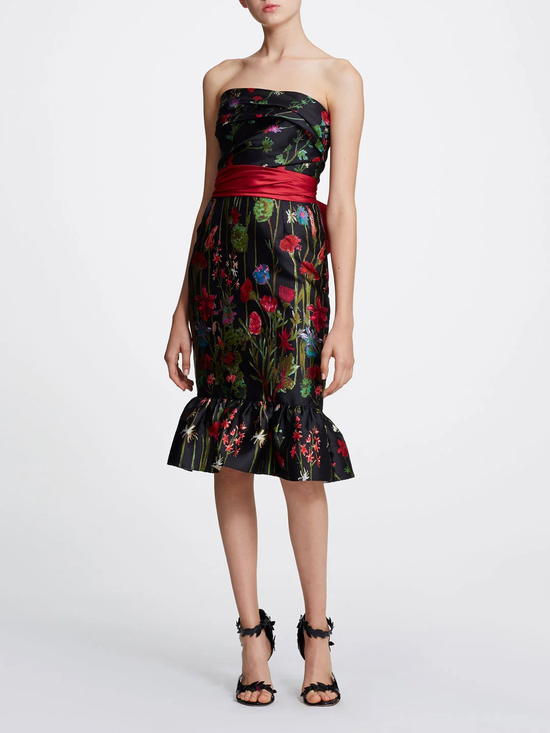 Strapless printed floral mikado cocktail dress in black featuring a peplum hem, mikado draped waistband and bow, a back zip fastening, a fitted silhouette, a back tie fastening and a knee length. Model is 5 ft 10 in wearing size 2. This item is Final Sale & will ship in 7–10 business days Sizing and Fit • Silhouettes are designed to fit true to size, following a classic American fit. • Clients familiar with European sizing may wish to consider sizing down for a closer fit. • Many styles are crafted from exquisite woven fabrics, often adorned with delicate embellishments, and are intended to maintain their structure without stretch unless otherwise specified. • For bespoke sizing guidance or personalized assistance, our concierge team is delighted to help at concierge@marchesafashion.com.